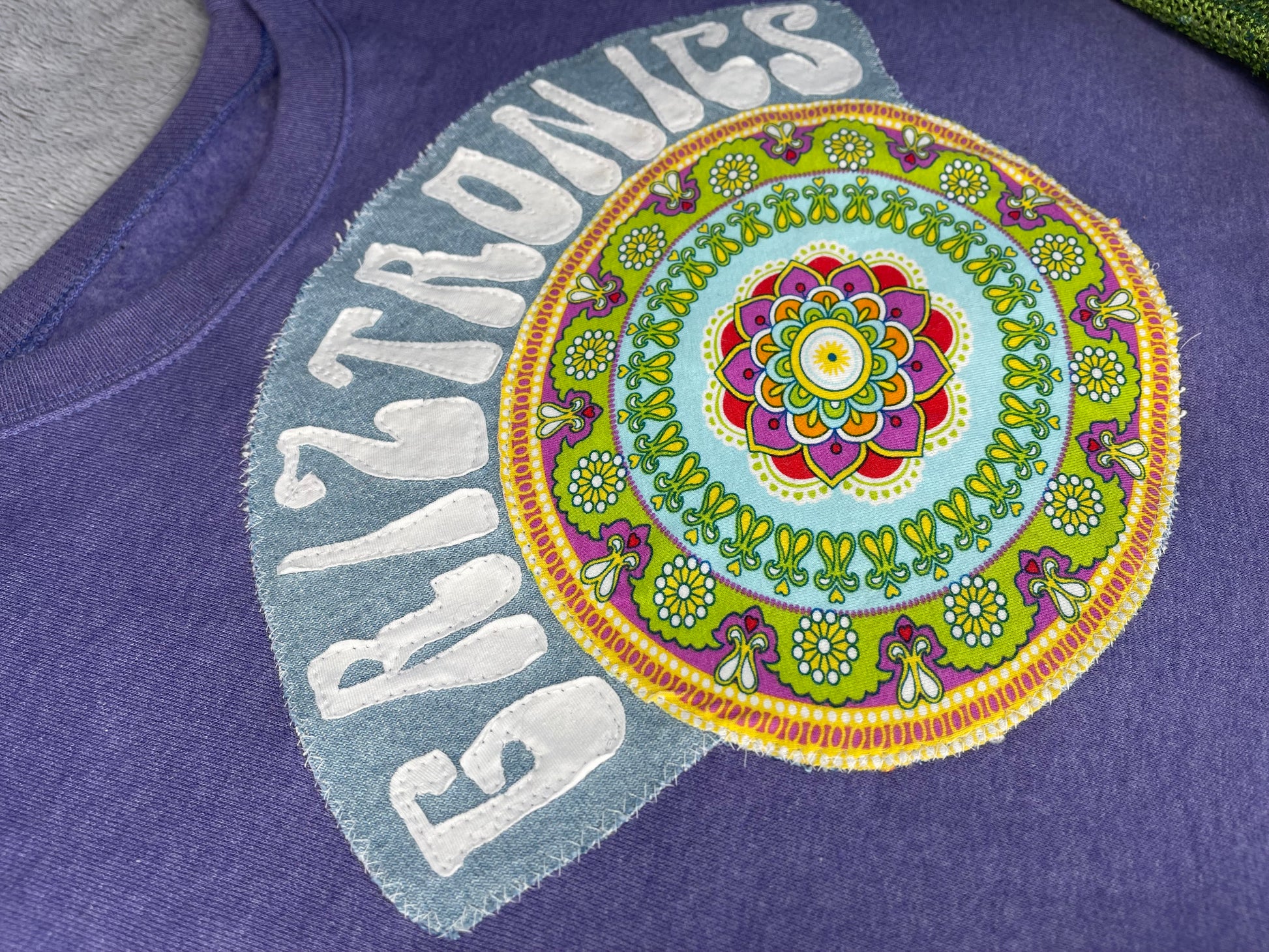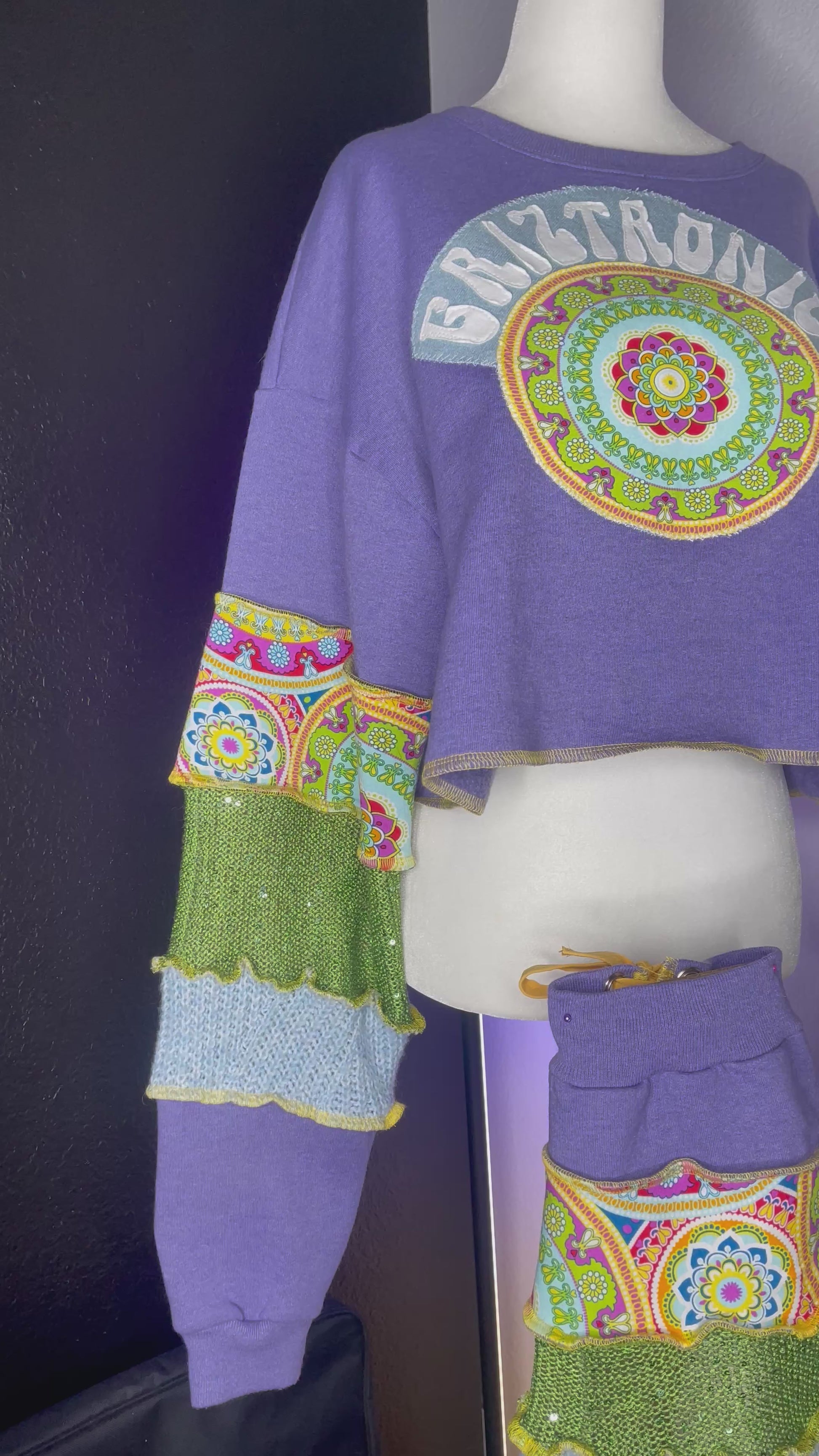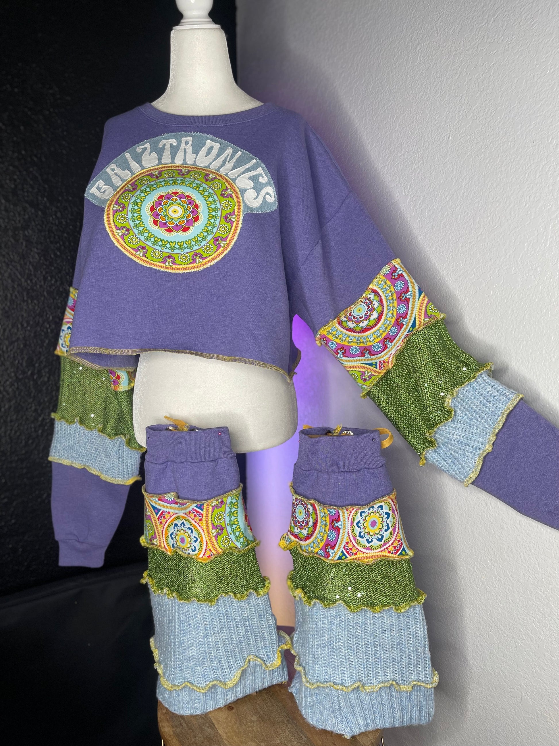 The base of this top is made from cozy crew neck sweatshirt with a patchwork sleeve constructed from various knit sweaters. Matching adjustable leg warmers made from the same materials. Griztronics logo and mandala is cut and sewn down individually with layers of fabric to create a unique image. Every top and leg warmers set is one of a kind and will never be recreated.