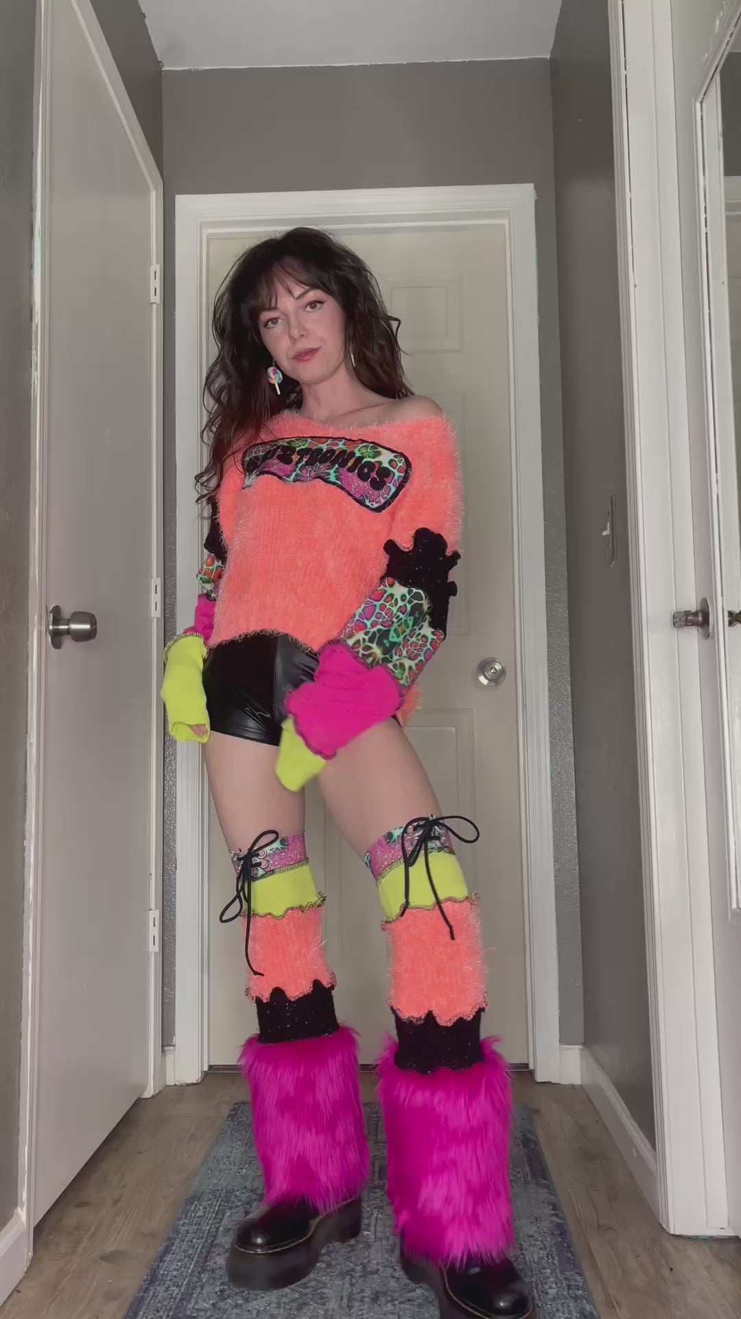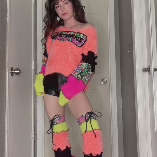 The base of this top is made of a super soft and fuzzy sweater material with a patchwork sleeve constructed from knit sweaters. Matching leg warmers made from the same materials plus faux fur at the bottom for a fluffy vibe. Mushroom and Griztronics logo are all cut and sewn down individually with layers of fabric to create a unique image. Every top and leg warmers set is one of a kind and will never be recreated.
